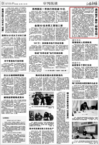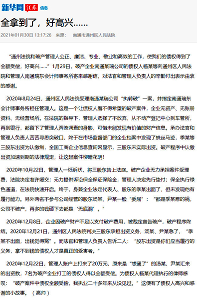 江蘇法制報截圖 近日“南通瑞東會計(jì)師事務(wù)所”的名字,不斷出現(xiàn)在《新華網(wǎng)》《江蘇法制報》的報道之中。一個小會所名字出現(xiàn)到主流新聞媒體中,實(shí)屬罕見。這要從我所承辦的一起破產(chǎn)案件說起。 2020年8月24日,通州區(qū)人民法院受理南通某瑞公司“執(zhí)轉(zhuǎn)破”一案,并指定南通瑞東會計(jì)師事務(wù)所擔(dān)任管理人。這是一個典型的企業(yè)無資產(chǎn)、無賬冊資料、無經(jīng)營場所的三無企業(yè),債權(quán)人看不到任何受償希望的破產(chǎn)案件。 南通瑞東會計(jì)師事務(wù)所由多名專業(yè)人員組成的清算組,主任會計(jì)師吳林海親自帶隊(duì)。在承辦法院的指導(dǎo)下,管理人從不動產(chǎn)登記中心到車管所,再到銀行,四處奔波,全方位開展資產(chǎn)調(diào)查工作,可惜仍未能發(fā)現(xiàn)有價值的財產(chǎn)信息。管理人團(tuán)隊(duì)苦苦尋思突破口,仔細(xì)尋找蛛絲馬跡,終于在稅務(wù)局申報表和市場監(jiān)督部門的企業(yè)檔案中發(fā)現(xiàn)了有益線索。原來債務(wù)人公司季某等三股東出資為認(rèn)繳制,全國工商企業(yè)信息查詢網(wǎng)顯示,三股東均未實(shí)際出資。根據(jù)企業(yè)進(jìn)入破產(chǎn)程序股東認(rèn)繳出資加速到期的法律規(guī)定,讓這起案件柳暗花明! 2020年10月22日,管理人一紙?jiān)V狀,將三股東告上法庭在申請?jiān)V訟保全后,債務(wù)人企業(yè)無力提供訴訟保全保證保險金的情況下管理人毅然決然決定有管理人機(jī)構(gòu)自己先行墊付,申請法院進(jìn)行了保全保全。終于,身兼企業(yè)法定代表人、股東的季某出面了,但未發(fā)現(xiàn)他有履行能力。另外兩名不參與公司經(jīng)營的股東湯某、尹某一臉“委屈”:“都是季某惹的禍,公司不破產(chǎn),再多的錢砸下去都是‘無底洞’。但是法律是公正的,2020年12月21日,通州區(qū)人民法院判決三股東必須承擔(dān)出資義務(wù)。管理人負(fù)責(zé)人告知被告“股東出資是你們應(yīng)當(dāng)履行的義務(wù),拿不到錢的債權(quán)人才是真正的受害者!逼扔诜傻耐,2020年12月22日,“想通了”的湯某、尹某向管理人賬戶打來了20萬元,最終, 7名打工人員全額拿回血汗錢! “破產(chǎn)管理人專業(yè)、敬業(yè)和高效的工作,使我們的債權(quán)得到了全額受償,好高興……”1月29日,破產(chǎn)企業(yè)南通某瑞公司的債權(quán)人楊某等向管理人南通瑞東會計(jì)師事務(wù)所寄來感謝信,對管理人的辛勤付出表示由衷的感謝。 為債權(quán)人楊某代理執(zhí)行的律師感嘆:“破產(chǎn)案件中債權(quán)全額受償,我執(zhí)業(yè)二十多年來從沒見過! 盡職、盡力、盡心、盡我所能,維護(hù)債權(quán)人的利益、維護(hù)法律的權(quán)威這是南通瑞東會計(jì)師事務(wù)所作為破產(chǎn)管理人一貫堅(jiān)持的基本原則。所承辦案件得到債權(quán)人的認(rèn)可,得到法院的肯定,這是管理人的最大榮譽(yù)。 |