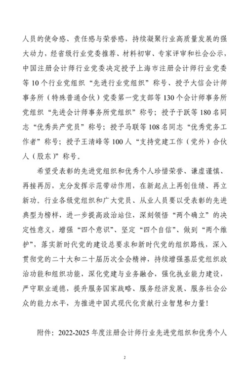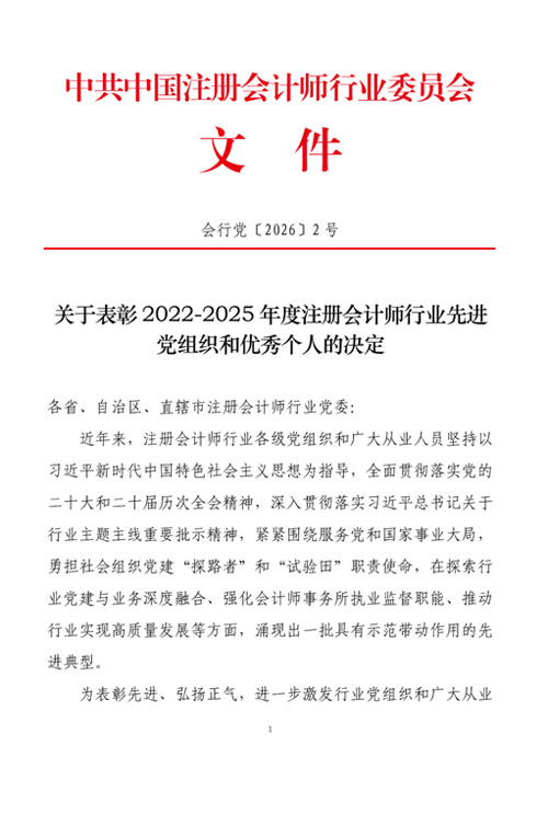 近日,收到中共中國注冊(cè)會(huì)計(jì)師行業(yè)委員會(huì)文件《關(guān)于表彰2022-2025年度注冊(cè)會(huì)計(jì)師行業(yè)先進(jìn)黨組織和優(yōu)秀個(gè)人的決定》,我所主任會(huì)計(jì)師吳林海同志榮獲注冊(cè)會(huì)計(jì)師行業(yè)“優(yōu)秀黨務(wù)工作者”稱號(hào)。 此次榮獲“優(yōu)秀黨務(wù)工作者”稱號(hào),不僅是對(duì)其個(gè)人工作的認(rèn)可,也是對(duì)我所黨建工作的高度肯定。 我所將以此次獲獎(jiǎng)為契機(jī),進(jìn)一步加強(qiáng)黨建工作,深化黨建與業(yè)務(wù)融合,提升服務(wù)質(zhì)量,堅(jiān)守職業(yè)道德,不斷增強(qiáng)服務(wù)國家戰(zhàn)略、服務(wù)經(jīng)濟(jì)發(fā)展、服務(wù)社會(huì)公眾的能力。 附件: